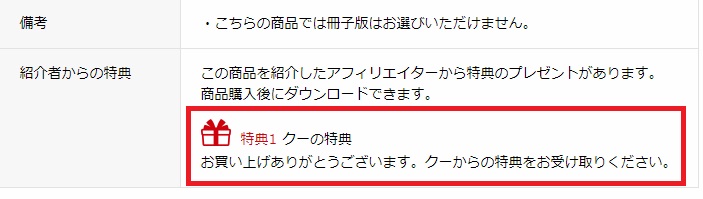 特典を受け取るためには、下の図の表示(四角い赤枠)が購入画面にあることをご確認のうえ、ご購入ください。(※ご確認いただけない場合は、特典は提供できませんので、ご注意ください)